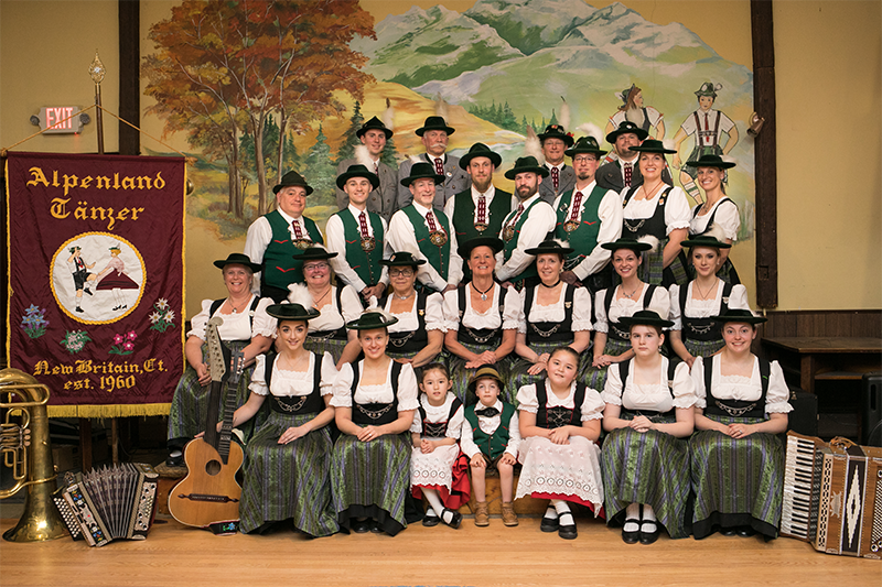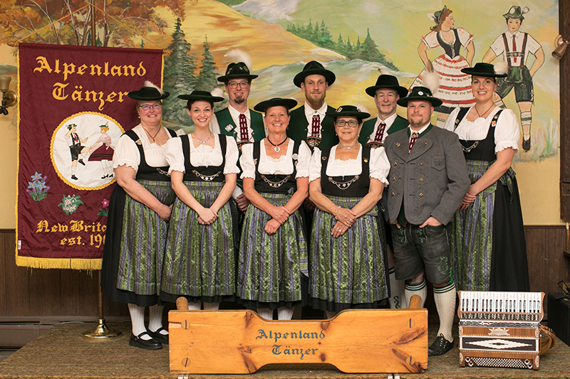 In the years following Walter Kober’s retirement in 1985, the Alpenland Tänzer has continued to grow and prosper. We have danced at German, Austrian and other clubs, convalescent homes and senior residences, Oktoberfests, international festivals, church functions, even in front of the Rock Cats’ Stadium, around Connecticut and beyond, in a wide variety of settings. We wear authentic traditional clothing, called Tracht, from the region around Miesbach in Bavaria, Germany. We have 8 to 12 dancing couples in our adult group, dancing traditional Schuhplattler and figure dances of the Alpine regions, entertain with sing-alongs to accordion or button-box and guitar music, and play the bells. Our Repertoire consists of authentic Bavarian Schuhplattler and figure dances, as well as other performances. It is our great joy to share the music and dance of Schuhplatteln with others.